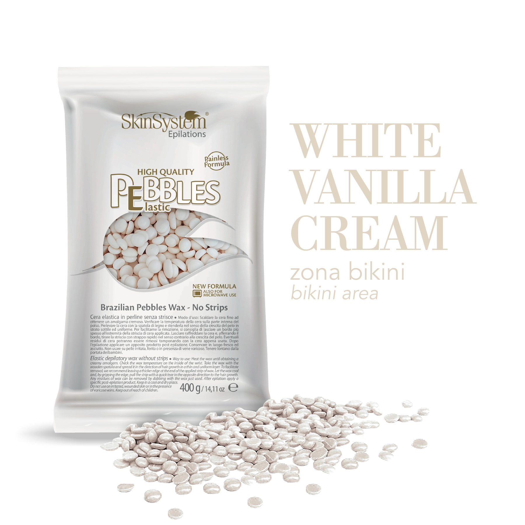 Brazilian Pebbles Wax, the Brazilian wax in beads, safe and Made in Italy, concentrates in small capsules all the effectiveness and delicacy on the skin of SkinSystem products.PEBBLES High Quality WHITE VANILLA CREAM has a special formulation, enriched with beeswax, in order to allow for soft, precise and effective hair removal, suitable for small and medium applications. It is recommended for hair removal in the bikini area and in small delicate parts such as face and armpits. Its soft and elastic texture makes the tear ultra soft and effective while respecting the most sensitive skin. The essence of vanilla, released in the environment, stimulates sensoriality.The Brazilian Pebbles Wax of SkinSystem are an innovative product born of traditional hair removal methods, reformulated and enriched with precious raw materials.- Practical and fast, easy to use and disposable- Dermatologically tested, respectful of even the most delicate skin- Multidirectional, effective and widespread, it does not require double passes- Incorporates the hair with precision and tenacity, does not stick to the skin for painless hair removal- Melts at low temperature for maximum comfort on the skin- Avoids the formation of folliculitis and irritation- Slows down regrowth, reducing the number and diameter of hair and extending the time between one waxing and another- Can be removed without strips, for greater freedom of movement, also ideal for private parts and small parts- Leaves the skin smooth and silky for more than 3 weeks.Ingredients / inci
