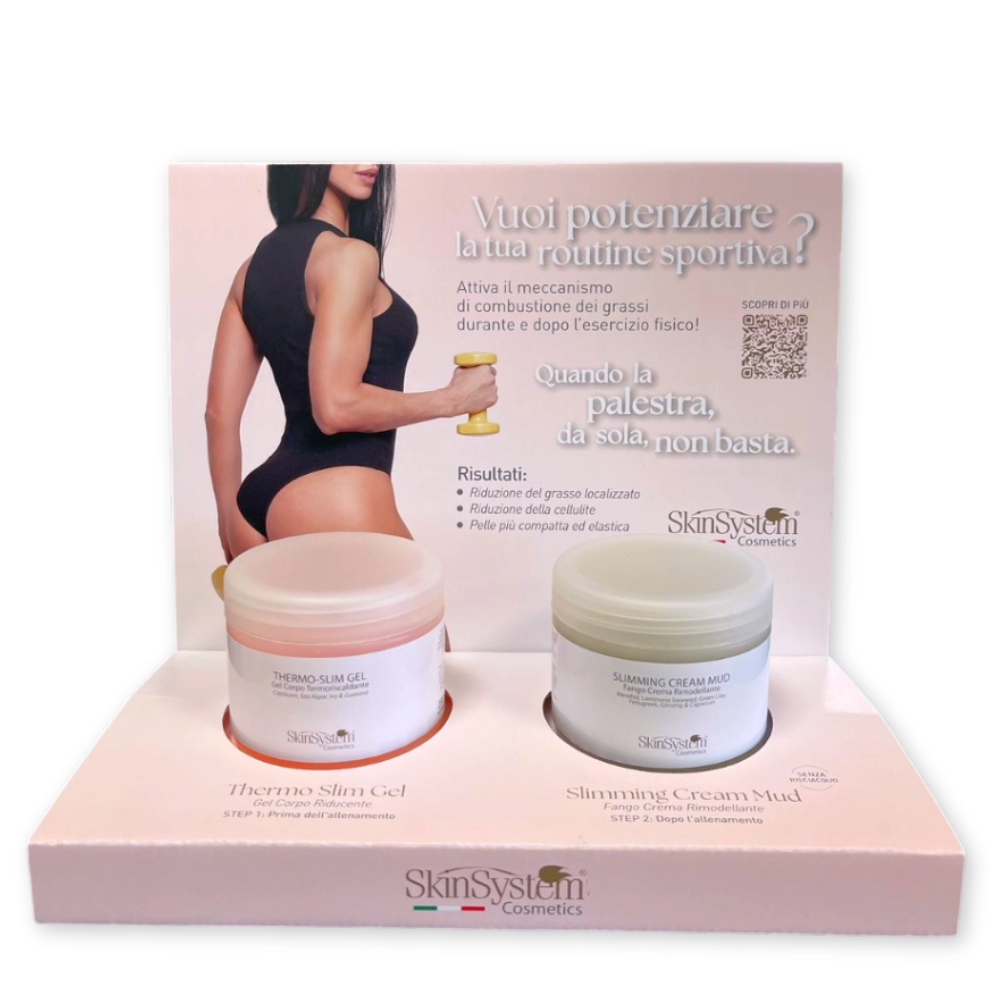 Kit includes: 4 Thermo Slim Gel, 4 Slimming Cream Mud, display stand.Ingredients / inci