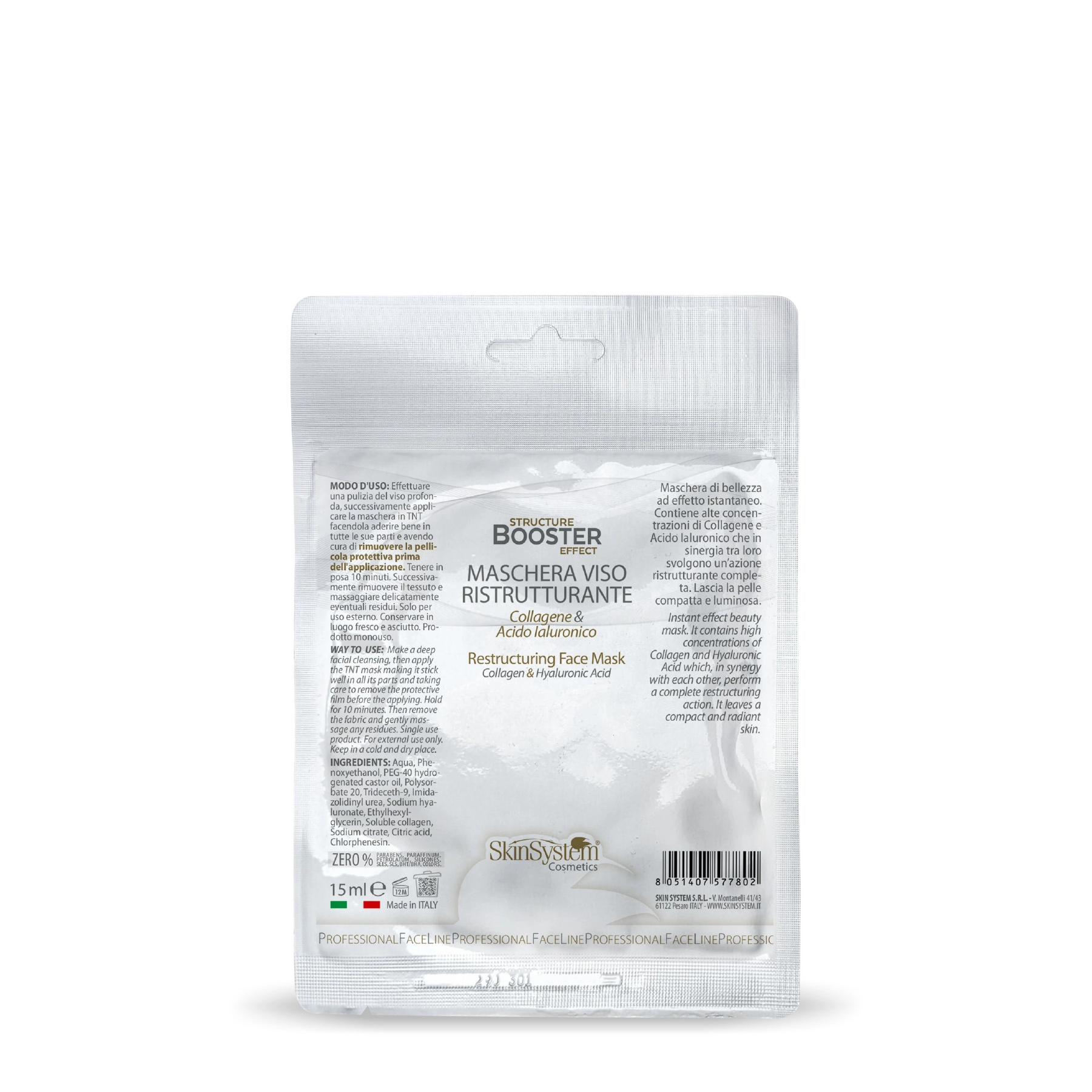 Beauty mask with an instant effect. Contains high concentrations of Collagen and Hyaluronic Acid, which in synergy with each other perform a complete restructuring action. Fragrance-free, it leaves the skin firm and radiant.Active ingredients